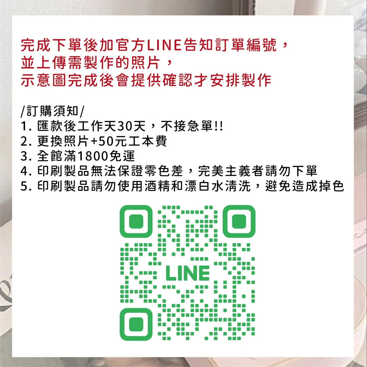 • 訂購流程:完成下單>加LINE傳照片>確認圖檔>等待出貨